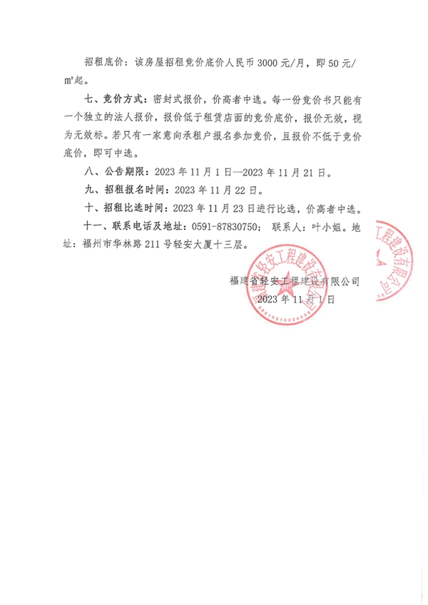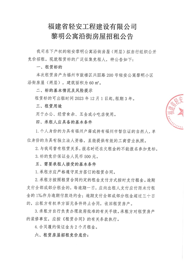 福建省輕安工程建設有限公司黎明公寓沿街房屋招租公告