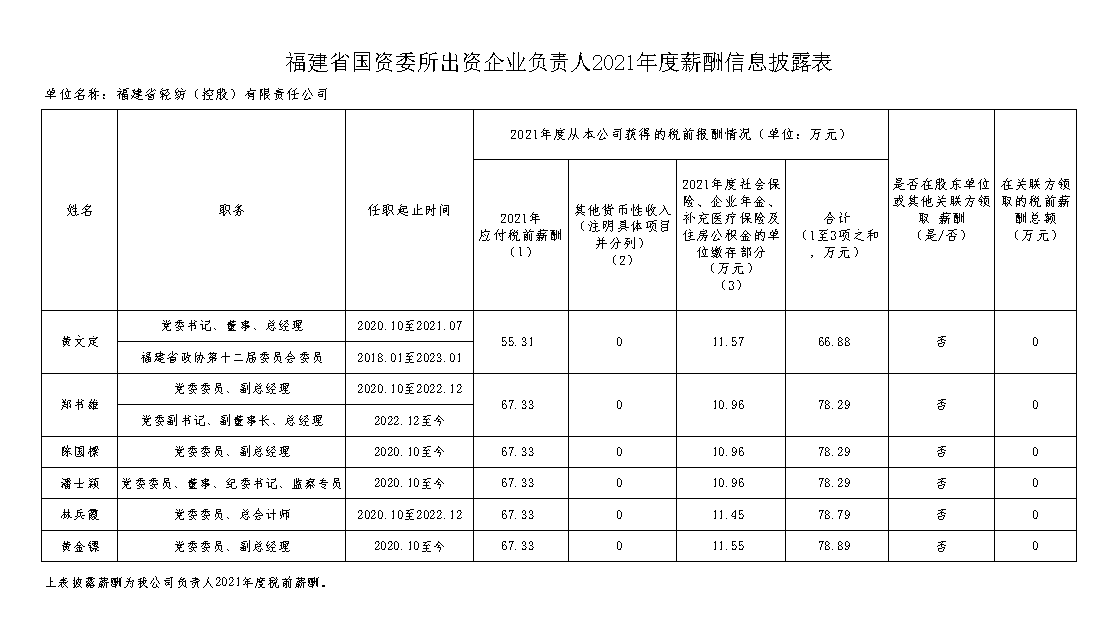 福建省國(guó)資委所出資企業(yè)負(fù)責(zé)人2021年度薪酬信息披露表