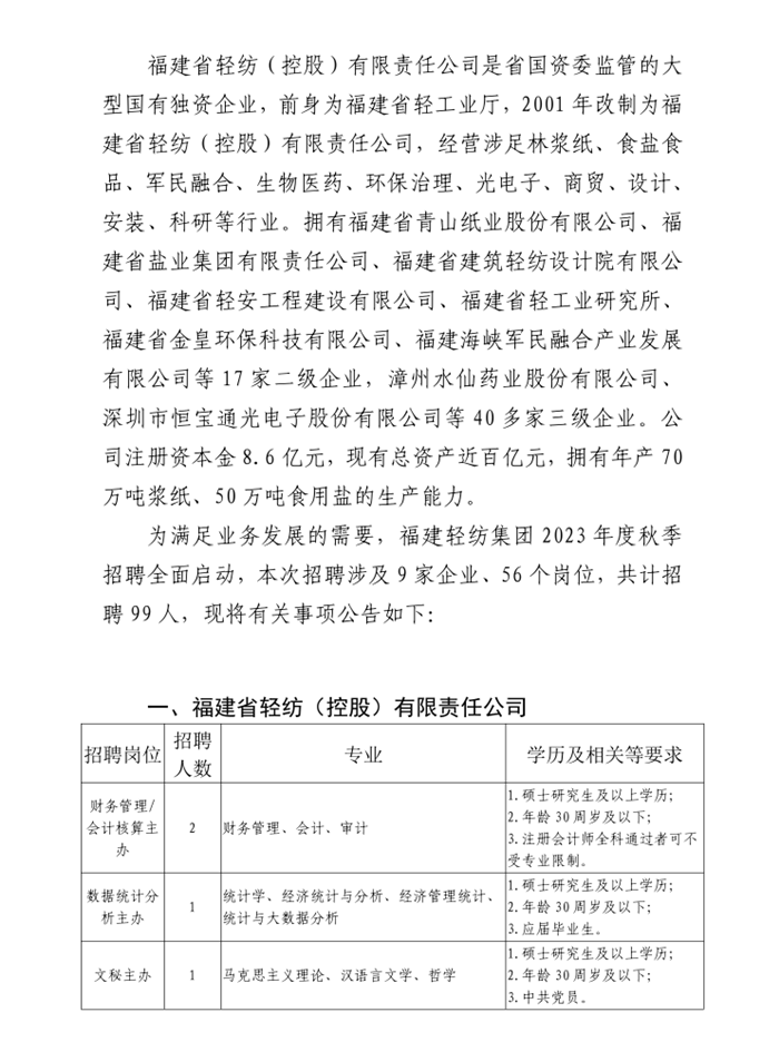 福建輕紡集團(tuán)2023年度秋季招聘公告